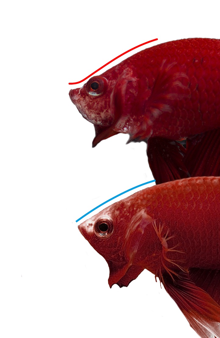 Genetická vada. Jedná se o deformaci, prohlubeň v oblasti hlavy. K tomuto tvaru hlavy mají sklony linie tzv. fighterů, kteří byli šlechtěni za účelem tradičních rybích zápasů v asijských zemích.